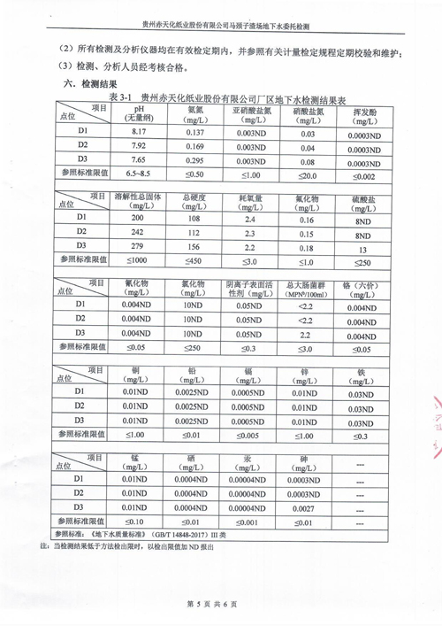 貴州赤天化紙業(yè)股份有限公司廠區(qū)地下水委托檢測(cè)